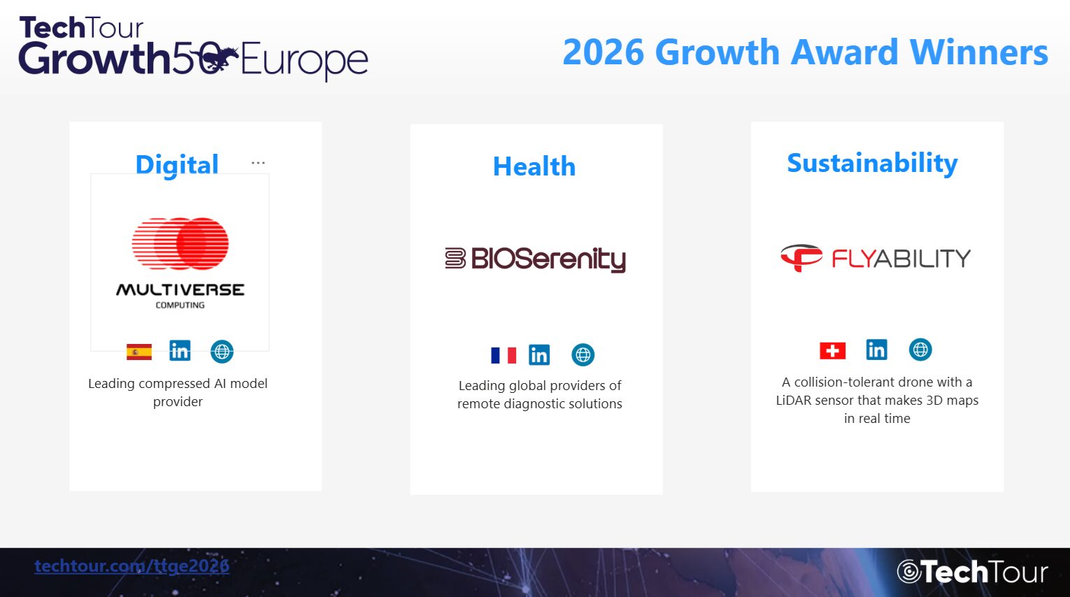 Yesterday, Tech Tour was proud to announce the 2026 Tech Tour Growth Award Winners, nominated among Europe’s 500 top scaling tech companies and voted and selected from the 2026 Tech Tour Growth 50 Europe List by some 70+of Europe’s most active investors. This year’s winners exemplify cutting-edge innovation, rapid market expansion, and the bold ambition to redefine the future of their respective sectors.