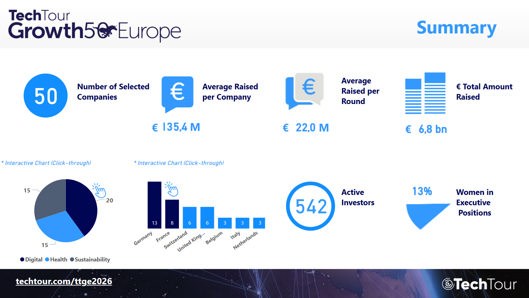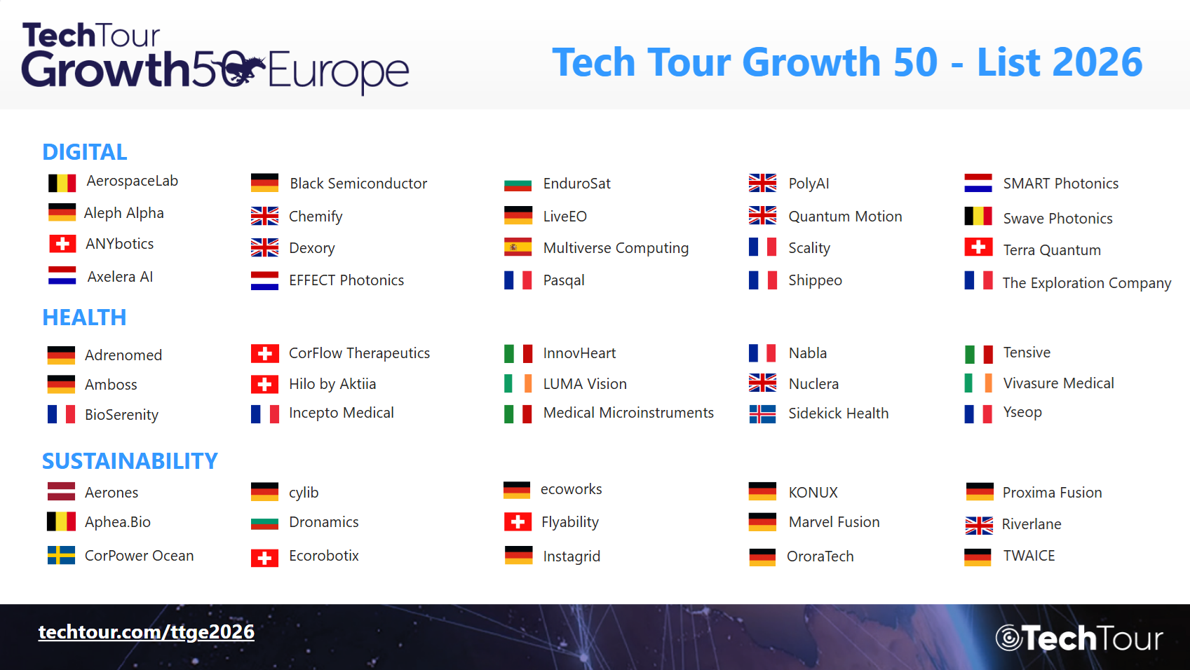 Today, Tech Tour announced the 2026 edition of the Tech Tour Growth50 Listing, highlighting Europe’s new generation of strategic tech champions and a prospect list of future European unicorns, as selected by the continent’s leading growth investors. Now in its twentieth year, the Listing showcases scale-up companies building the core digital, health, and sustainability technologies that will define Europe’s competitiveness and resilience in the decade ahead. The 2026 cohort is distinctly deep-tech-driven, reflecting strong investor conviction in companies translating scientific excellence into large-scale commercial impact. (See the Tech Tour Growth50 List below, full report here.)